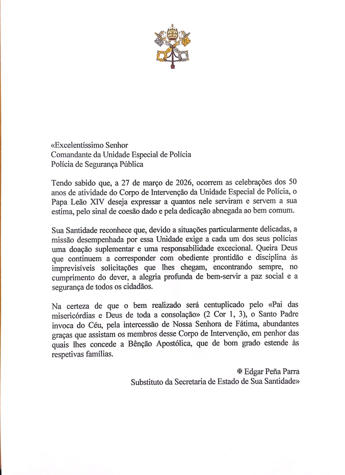 Na missiva, o Papa Leão XIV expressa “estima” por quantos serviram e servem no CI, destacando “o sinal de coesão dado e a dedicação abnegada ao bem comum”. O Santo Padre reconhece que a missão desta unidade “exige a cada um dos seus polícias uma doação suplementar e uma responsabilidade excecional”, invocando do Céu, pela intercessão de Nossa Senhora de Fátima, abundantes graças para os membros do Corpo de Intervenção e suas famílias.