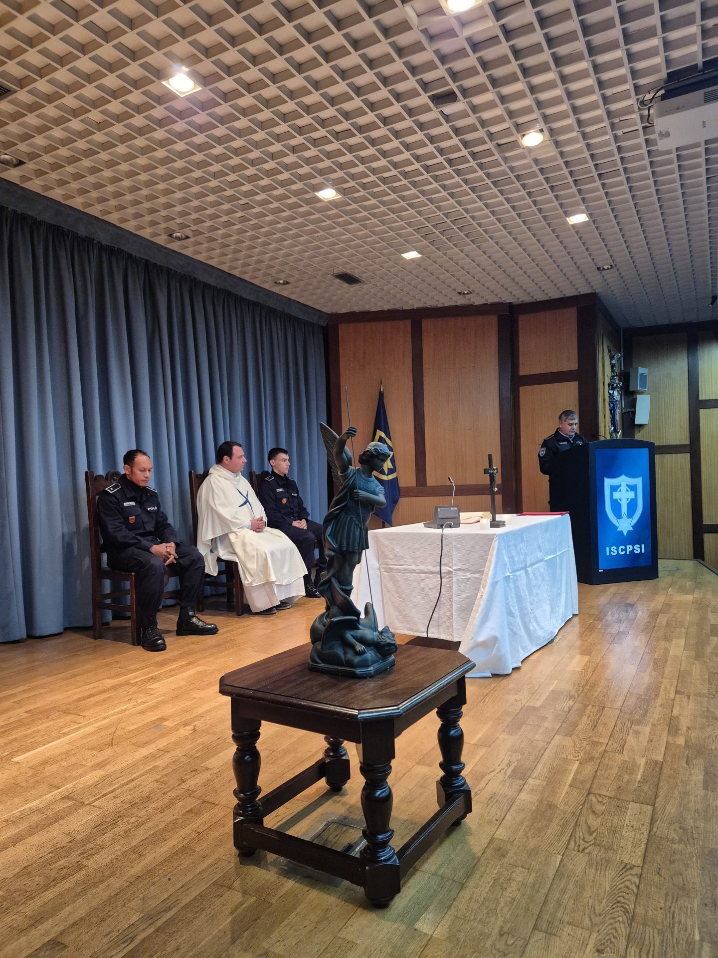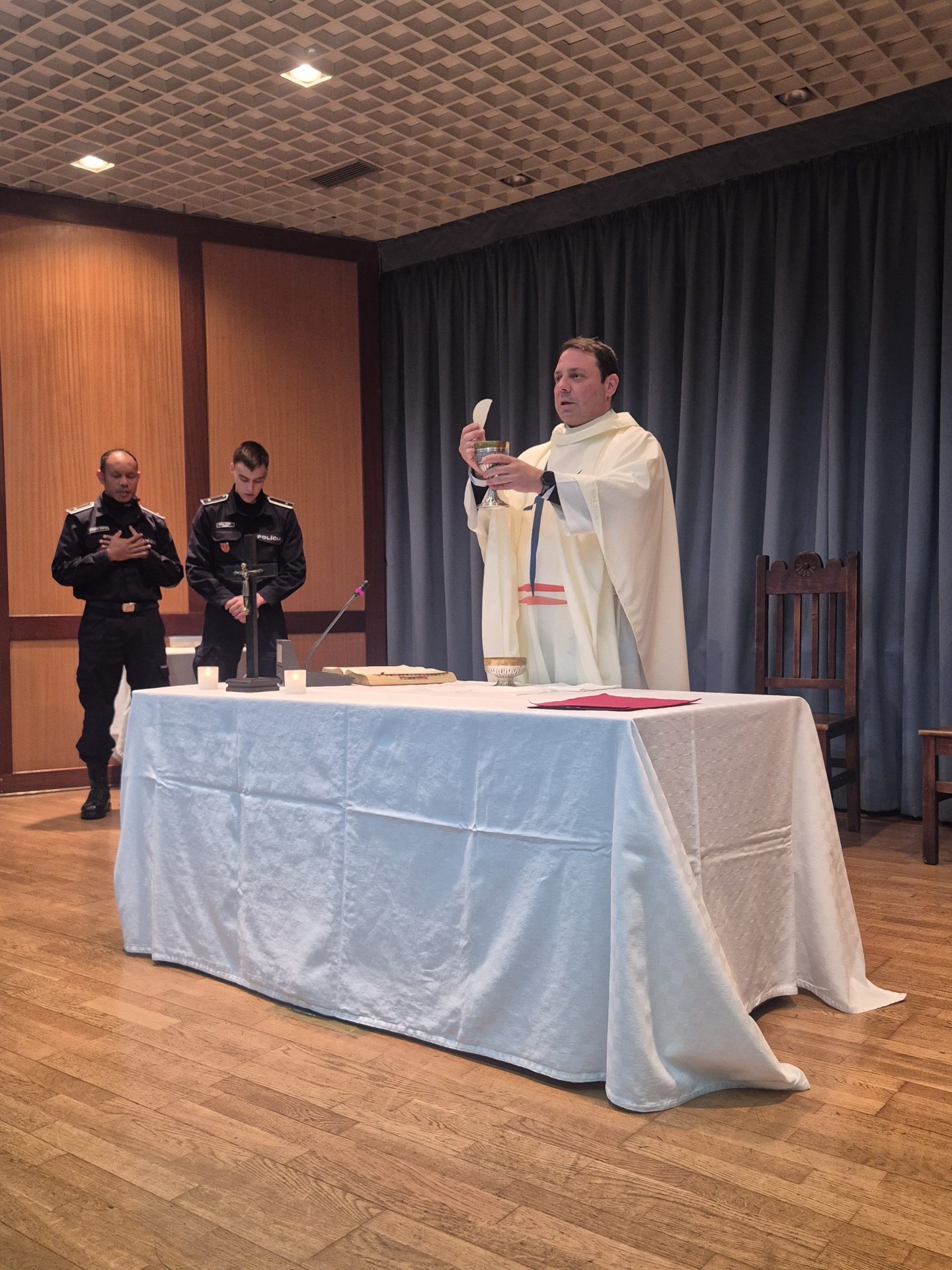 A Missa foi presidida pelo Capelão Adjunto para a PSP, Pe. Luís Leal, que, na sua homilia, salientou a necessidade do esforço individual que cada um deve colocar no seu trabalho diário. No seguimento das leituras, o celebrante lembrou que, seja no estudo académico ou no terreno de uma operação policial, o trabalho e a dedicação são fundamentais e insubstituíveis.