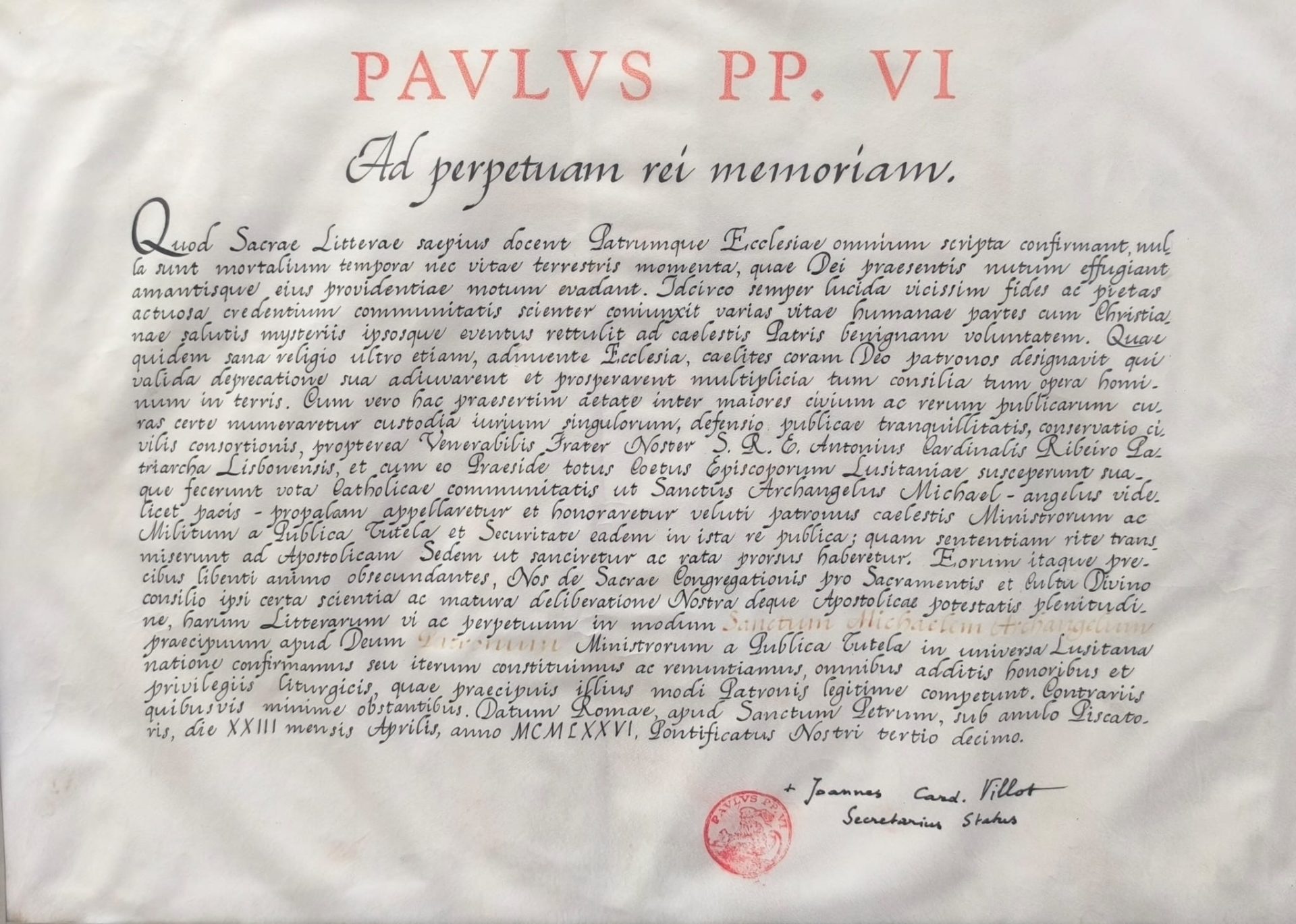 A 23 de abril de 1976, o Papa Paulo VI, através de Breve Apostólico, proclama São Miguel Arcanjo como “Patrono principal junto de Deus dos Agentes da Segurança Pública em toda a nação Portuguesa”.